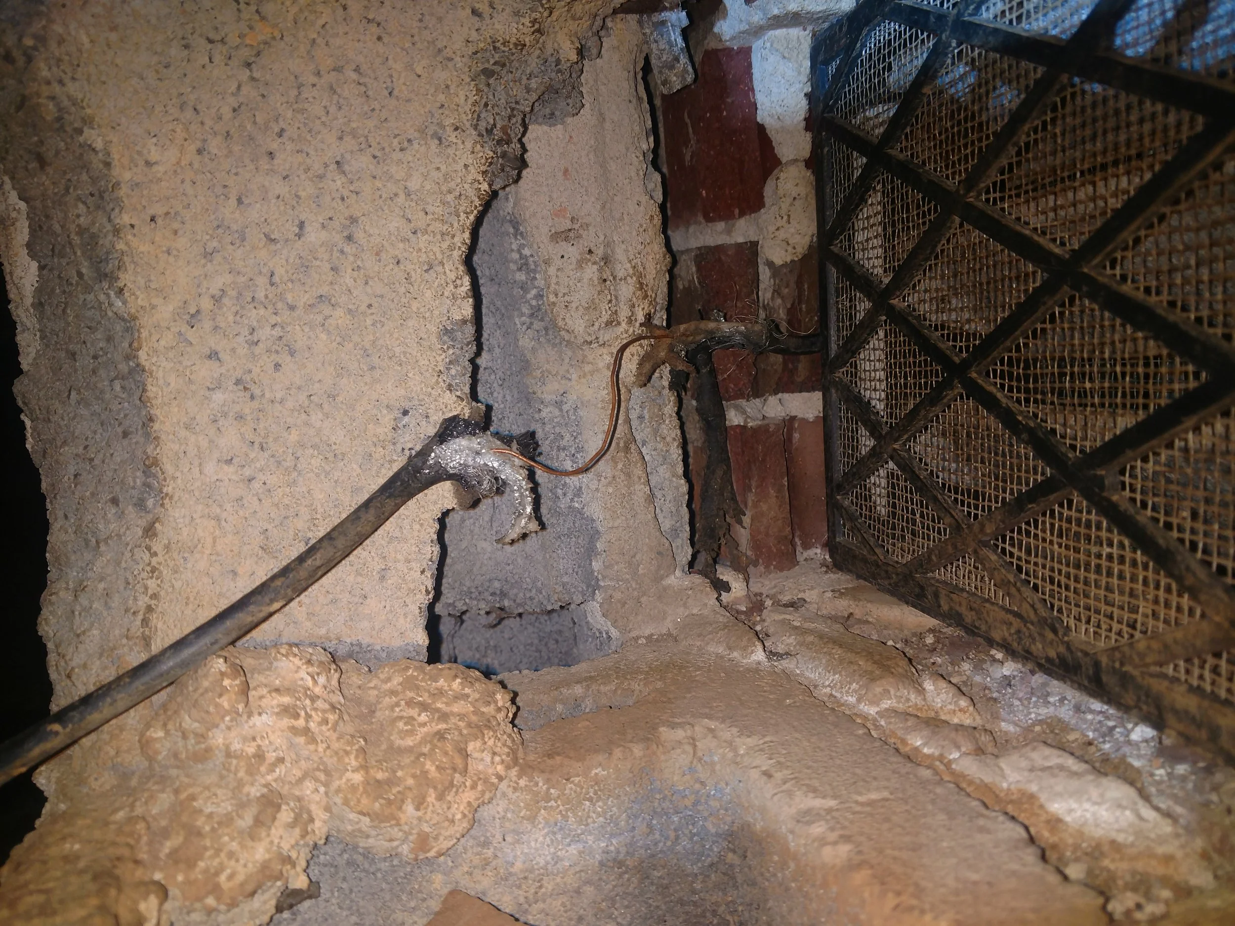 I was a little surprised at finding the opossum and I still wasn’t sure how it got in. Now I had to figure that out. I talked to Vici C again. She mentioned that she had seen insulation in the AC floor registers. That pointed me back to the HVAC system as the source of the problem, but where? There still weren’t any holes that I could find in the lines. Then Mrs. C. mentioned that the AC guys had found insulation inside the cabinet of the outside unit, so I decided to open it up. When I did, I found it! There was a hole tucked up underneath the joint between the ductwork and the brickwork of the house. Most units have a three sided shroud that joins the unit to the house which is usually how wildlife enters. Mrs. C. had a four-sided shroud which is several degrees better. Unfortunately they had done a bad job of joining it to the house and there was a much bigger gap hidden underneath than what I had seen on the first inspection. It was about impossible to see this gap, even with a flashlight. But, to a “low to the ground” animal like an opossum, it was quite obvious.