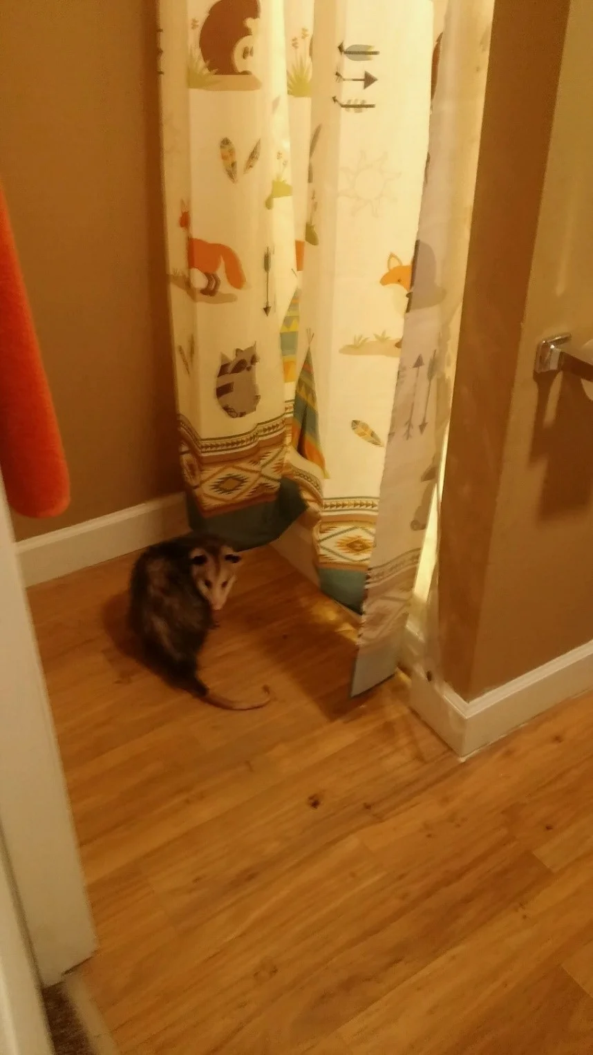 Opossums are most likely to be found under buildings and not in attics. This Johnson City opossum fell through the ceiling of a downstairs room.