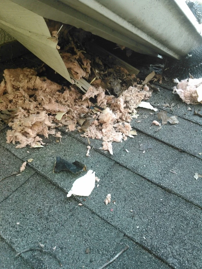 This soffit was packed with a combination of leaves, feces, shredded insulation, and shredded foam ventilation panels.